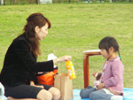 | 15分の休憩の間、芝生にシートをしいて青空の下でピクニック気分で、ご用意しました軽食を食べました。 |
