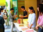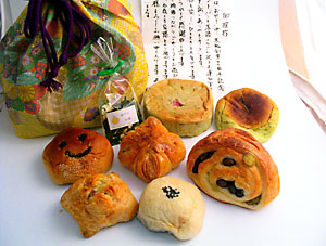 | 当日お土産にお渡ししたあん入りパンとお飲み物 落語を聴きながら、気楽にパンもお召し上がりいただきました。 2005年の中秋の名月(9月18日)にちなんで 様々な自家製あんと、様々なパン生地を組み合わせた7種類の木輪オリジナルあんパンをご用意しました。 お月見のお饅頭の代わりにゆず茶といっしょにほおばってみてはいかがでしょう。 |